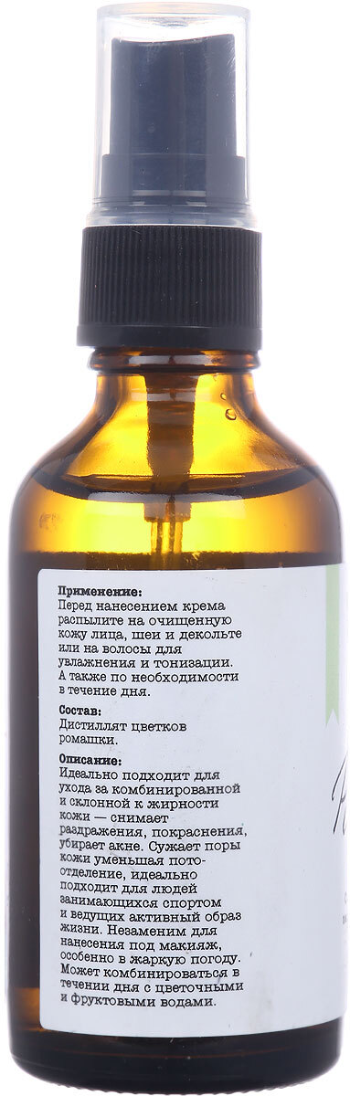 - Способ применения: В качестве тоника. Распылите на чистую кожу лица, шеи и декольте для успокаивающего и увлажняющего ухода перед нанесением крема. Для освежения и увлажнения в течение дня. Время от времени распыляйте на кожу лица (можно поверх макияжа). Особенно актуально в жаркую летнюю погоду либо при сухом воздухе от отопительных приборов или кондиционера. Для охлаждения и увлажнения после загара. Распылите на кожу лица и тела, чтобы успокоить, охладить и увлажнить её после воздействия солнца. Гидролат снимет покраснения и дискомфорт, ускорит регенерацию. Для лечения ожогов, укусов насекомых, ранок от акне, аллергии и раздражений. Сделайте компресс на пострадавший участок кожи. Ромашка быстро снимает боль и зуд, позволяя вам отвлечься от проблемы. Для увлажнения волос и смягчения действия водопроводной воды. Распылите на чистые волосы и распределите по всей длине с помощью расчёски. Также помогает уменьшить зуд кожи головы. Как компонент косметического льда и масок. В составе любых домашних средств гидролат может с успехом заменить воду. Также вы можете распылять гидролат сверху на нанесённую маску, чтобы предотвратить её высыхание. Для гигиены полости рта. Добавьте немного гидролата в воду, чтобы прополоскать рот. Полоскания рекомендованы при стоматитах, язвочках, кровоточивости дёсен. Для ухода за детской кожей. Можно использовать в виде компрессов, орошений, добавлять в воду для купания.