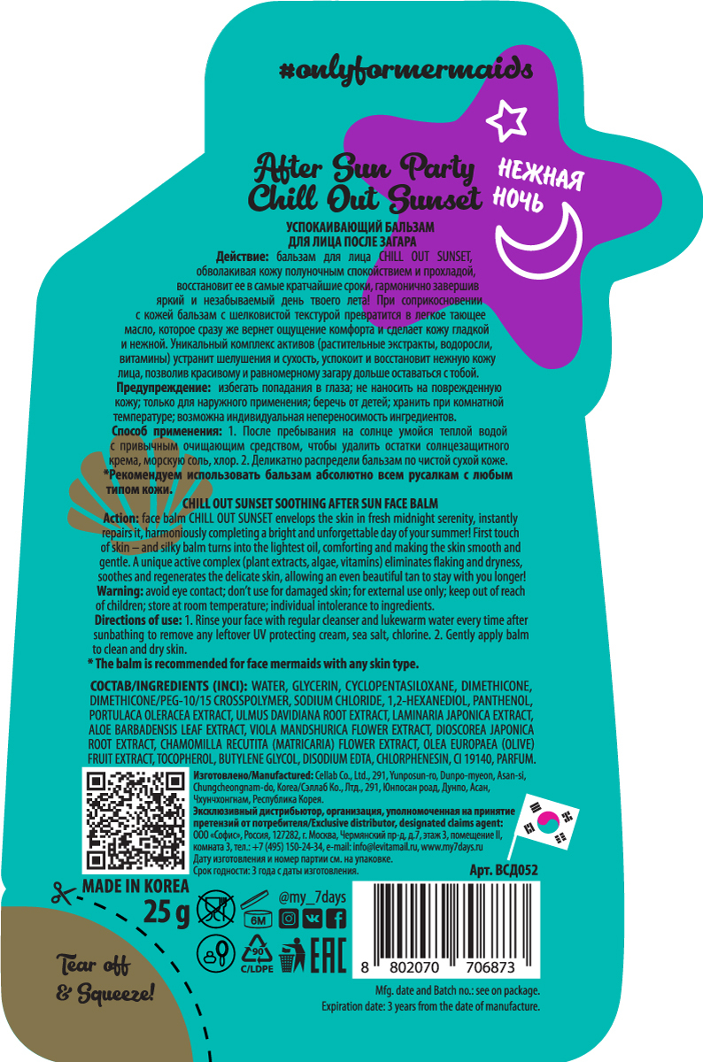 - Способ применения: 1. После пребывания на солнце умойся теплой водой с привычным очищающим средством, чтобы удалить остатки солнцезащитного крема, морскую соль, хлор. 2. Деликатно распредели бальзам по чистой сухой коже.