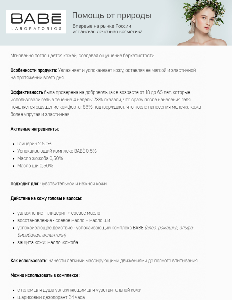 - Состав Глицерин 2,50%, успокаивающий комплекс babé (алоэ, ромашка, альфа-бисаболол, аллантоин) 1%, масло жожоба 0,50%, соевое масло 0,50%, масло ши 0,50%.