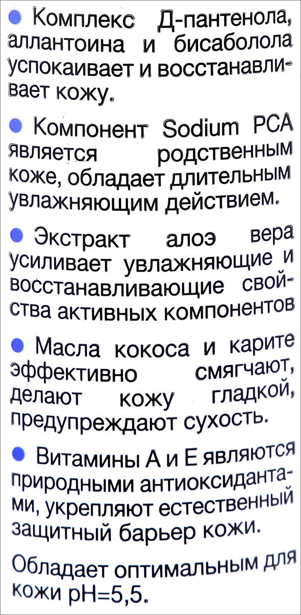 - Состав: Aqua, Cetearyl Alcohol, Glycerin, Cyclomethicone, Glyceryl Stearate, Butyrospermum Parkii Butter, Cocos Nucifera Oil, Isopropyl Palmitate, Panthenol, Sodium PCA, Aloe Barbadensis Gel, Allantoin, Bisabolol, Tocopheryl Acetate, Retinyl Palmitate, Citric Acid, Ascorbyl Palmitate, Propylene Glycol, Parfum, Potassium Cetyl Phosphate, Disodium Cetearyl Sulfosuccinate, Diazolidinyl Urea, BHT, Methylparaben, Propylparaben
