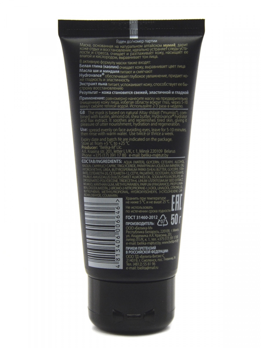 - Состав: AQUA (WATER), GLYCERIN, CETEARYL ALCOHOL, KAOLIN, CAPRYLIC/ CAPRIC TRIGLYCERIDE, PARAFFINUM LIQUIDUM (MINERAL OIL), HYDROXYETHYL UREA, BUTYROSPERMUM PARKII (SHEA) BUTTER, GLYCERYL STEARATE, CETEARETH-20, CETEARETH-12, CETYL PALMITATE, ISOSTEARYL ISOSTEARATE, PRUNUS AMYGDALUS DULCIS (SWEET ALMOND) OIL, SODIUM POLYACRYLATE, HYDROGENATED POLYDECENE, TRIDECETH-6, LINUM USITATISSIMUM SEED EXTRACT, MUMIJO, XANTHAN GUM, METHYLPARABEN, PARFUM (FRAGRANCE), PROPYLPARABEN, DISODIUM EDTA, 2-BROMO-2-NITROPROPANE-1,3-DIOL, LINALOOL, CITRONELLOL, BUTYLPHENYL METHYLPROPION