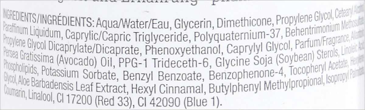 - Состав: Aqua/Water/Eau, Glycerin, Dimethicone, Propylene Glycol, Cetearyl Alcohol, Paraffinum Liquidum, Parfum/Fragrance, Caprylic/Capric Triglyceride, Polyquaternium-37, Behentrimonium Methosulfate, Propylene Glycol Dicaprylate/Dicaprate, Phenoxyethanol, Caprylyl Glycol, Limonene, Allantoin, Persea Gratissima (Avocado) Oil, PPG-1 Trideceth-6, Glycine Soja (Soybean) Sterols, Linoleic Acid, Phospholipids, Potassium Sorbate, Benzophenone-4, Tocopheryl Acetate, Geraniol, Hexylene Glycol, Linalool, Aloe Barbadensis Leaf Extract, Hydroxyisohexyl 3-Cyclohexene Carboxaldehyde, Isopropyl Palmitate, CI 15985 (Yellow 6).