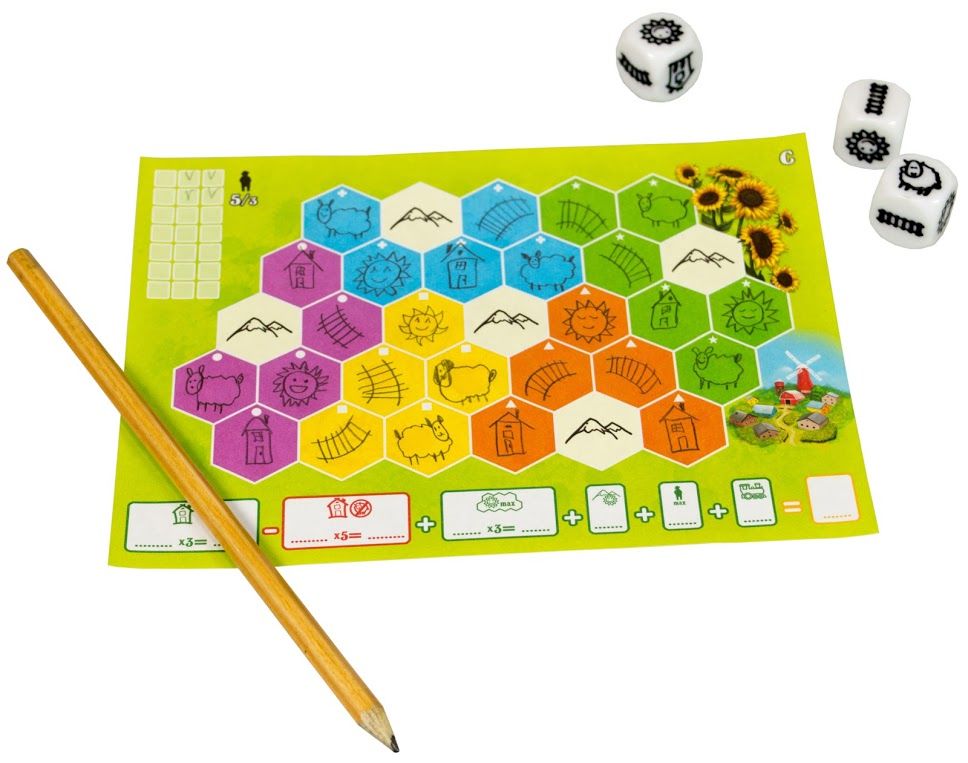 Креативная настольная игра, в которой каждому участнику предстоит создать на своем листе горную долину. В ходе партии вы будете выбирать доступные действия и рисовать домики для жителей, овечек на пастбищах, поля подсолнухов и железные дороги. Побеждает тот, кто сделает свою долину самой удобной для жизни.