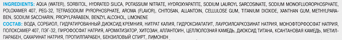 - Состав: вода, сорбитол, гидратированный диоксид кремния, нитрат калия, гидроксиапатит, лаурил саркозинат натрия, полоксамер 407, ПЭГ-32, пирофосфат тетранатрия, ароматизатор, хитозан, аллантоин, целлюлозная камедь, фторид натрия, диоксид титана, ксантановая камедь, метилпарабен, сахаринат натрия, пропилпарабен