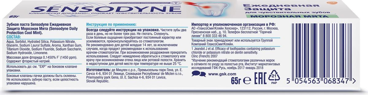 • Состав Aqua, Sorbitol, Hydrated Silica, Potassium Nitrate, Glycerin, Sodium Lauryl, Aroma, Xanthan Gum, Titanium Dioxide, Sodium Saccharin, Sodium Fluoride, Sodium Hydroxide