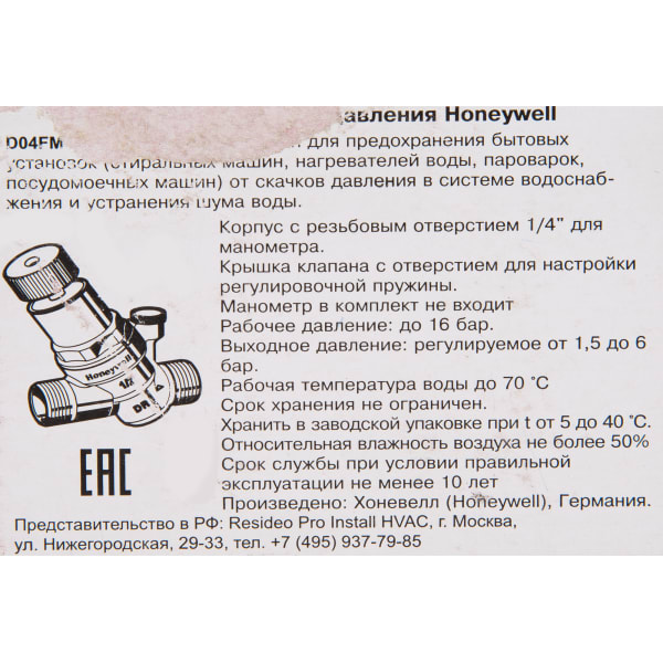 Клапан понижения давления Honeywell, с внутренней резьбой, 1/2"