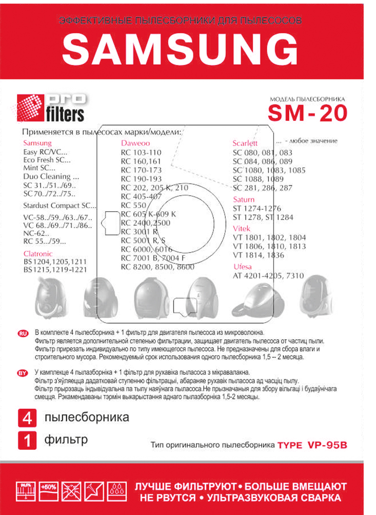 • Для моделей Samsung SC 31/51/69/70/72/75, VC-58/59/63/67/68/69/71/86, NC-62, RC 55/59; Clatronic BS 1204, 1205, 1211, 1215, 1219-1221; Daweoo RC 103-110, 160, 161, 170-173, 190-193, 202, 205 K, 210, 405-407, 550, 605 K-609 K, 2400, 2500, 3001R, 5001R, S, 6000, 6