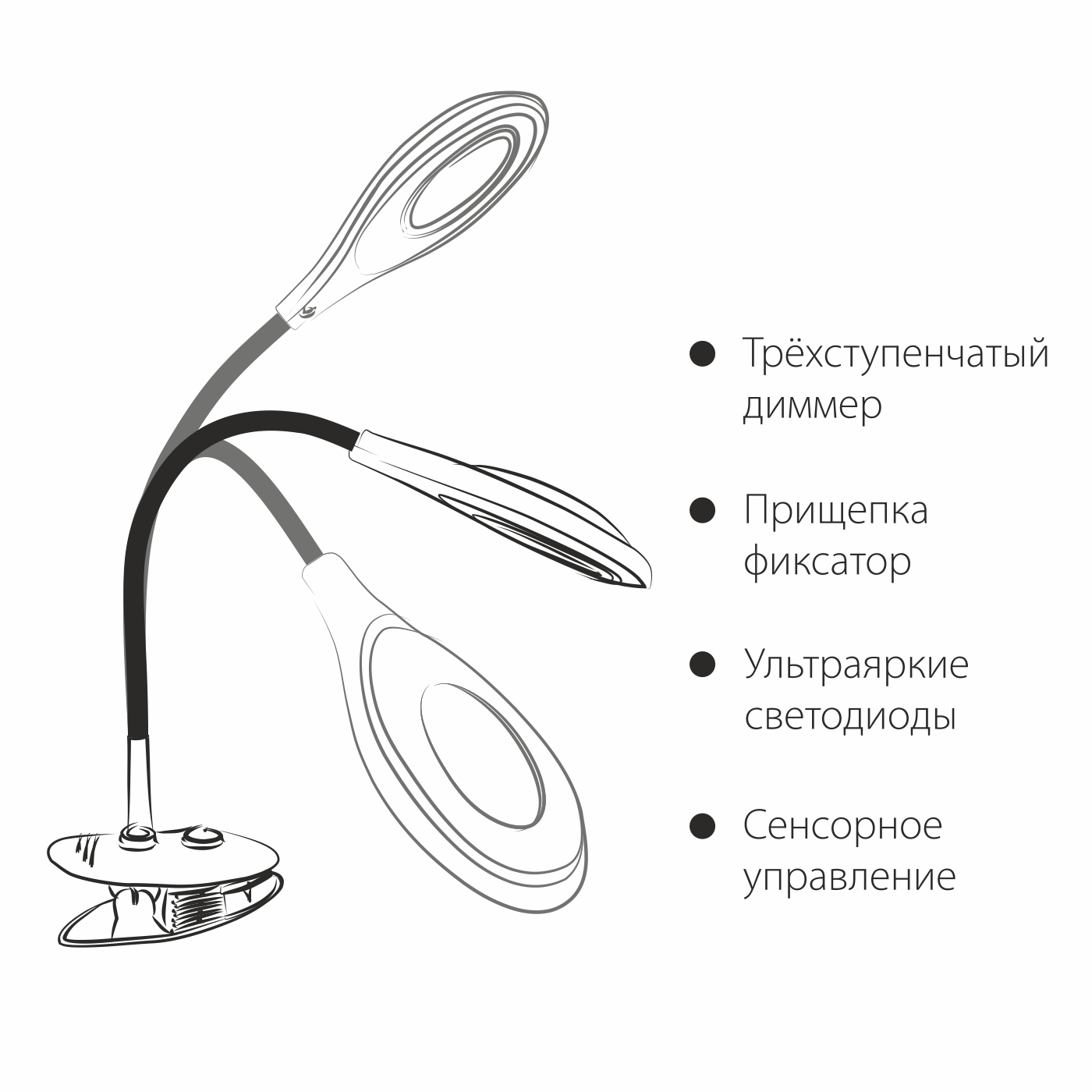 • Дополнительные характеристики сенсорное управление; поворотный механизм; регулятор яркости; прищепка