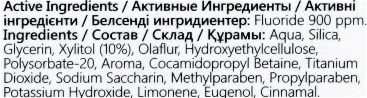 - Состав: Aqua, Silica, Glycerin, Xylitol (10%), Olaflur, Hydroxyethylcellulose, Polysorbate-20, Aroma, Cocamidopropyl Betaine, Titanium Dioxide, Sodium Saccharin, Methylparaben, Propylparaben, Potassium Hydroxide, Limonene, Eugenol, Cinnamal.