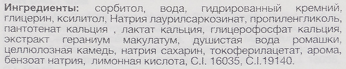 - Состав: сорбитол, вода, гидратирований диоксид кремния, глицерин, ксилитол, натрия лаурилсаркозинат, пропиленгликоль, пантотенат кальция, лактат кальция, глицерофосфат кальция, экстракт гераниум макулатум, цветочная вода ромашки аптечной, целлюлозная камедь, сахарин натрия, токоферола ацетат, аромат, бензоат натрия, лимонная кислота, С.И. 16035, С.И. 19140