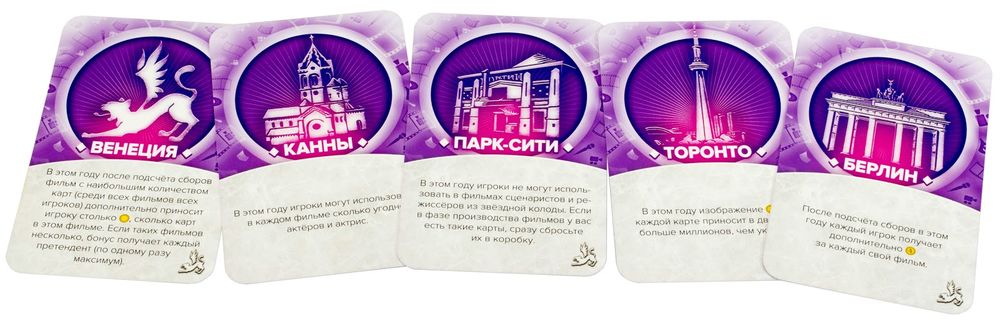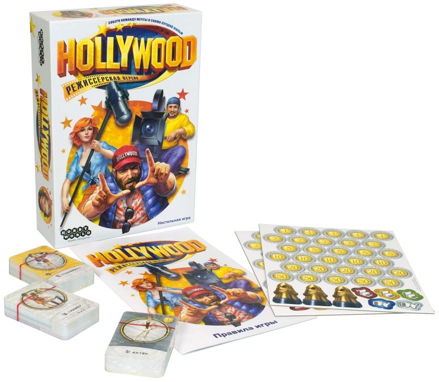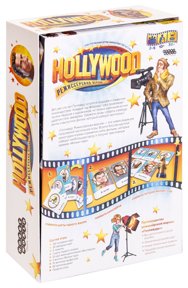 Новая редакция популярной настольной игры «Голливуд». В роли боссов крупной киностудии участники стремятся снять фильмы, которые соберут наибольшую кассу и получат престижную премию «Фильм года». Количество игроков: 2-5. Рекомендуемый возраст: 10+. Продолжительность игры: от 30 мин.