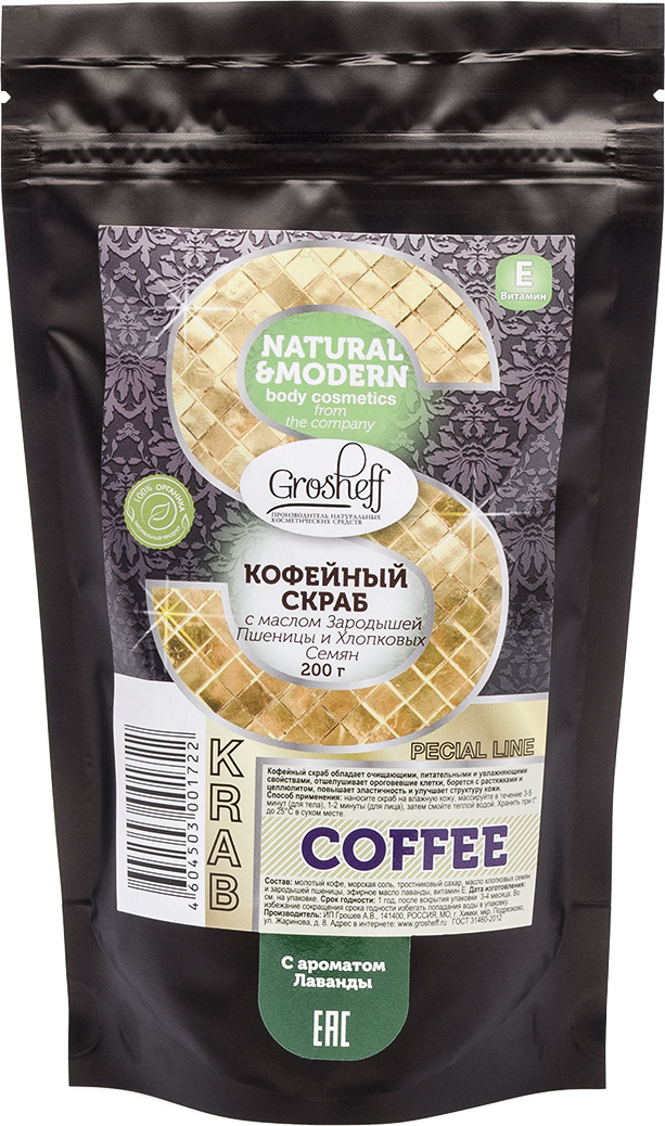 - Состав молотый кофе, морская соль, тростниковый сахар, масло хлопковых семян и зародышей пшеницы, эфирное масло лаванды, витамин Е.
