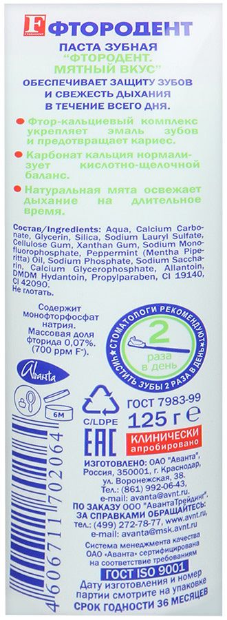 - Состав: вода, карбонат кальция, глицерин, лаурилсульфат натрия, натрий карбоксиметилцеллюлоза, ксантановая камедь, диоксид кремния, монофторфосфат натрия, ароматизатор, натрий фосфорнокислый, сахарин натрия, триклозан, глицерофосфат кальция, ДМДМ – гидантоин, пропилпарабен.