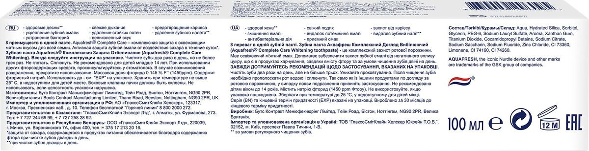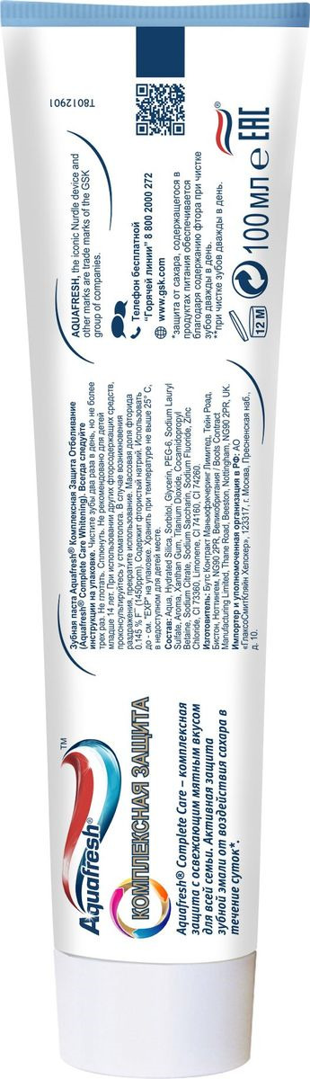 Зубная паста Aquafresh Комплексная защита Отбеливание, 100 мл