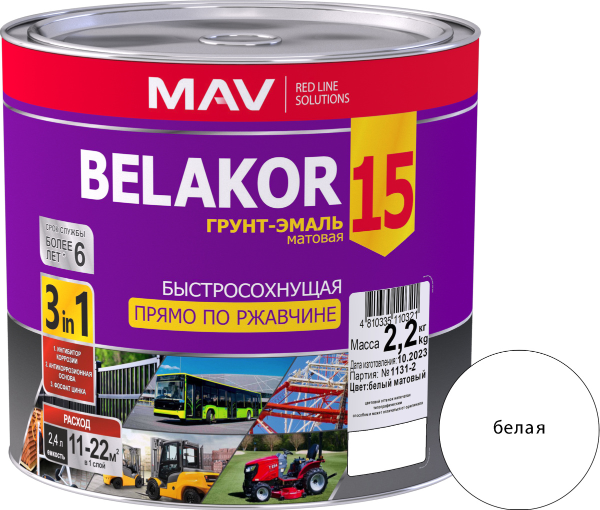 Грунт-эмаль BELAKOR 15 прямо по ржавчине 3 в 1 быстросохнущая белая матовая 2,4л (2,2кг)
