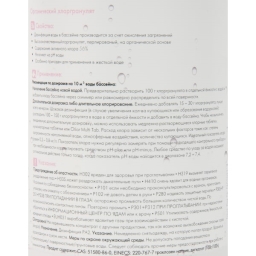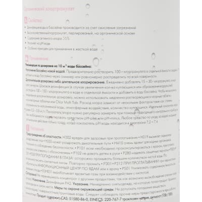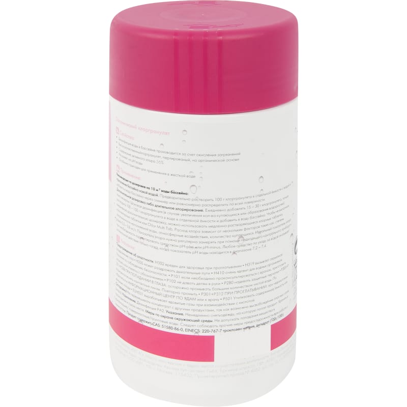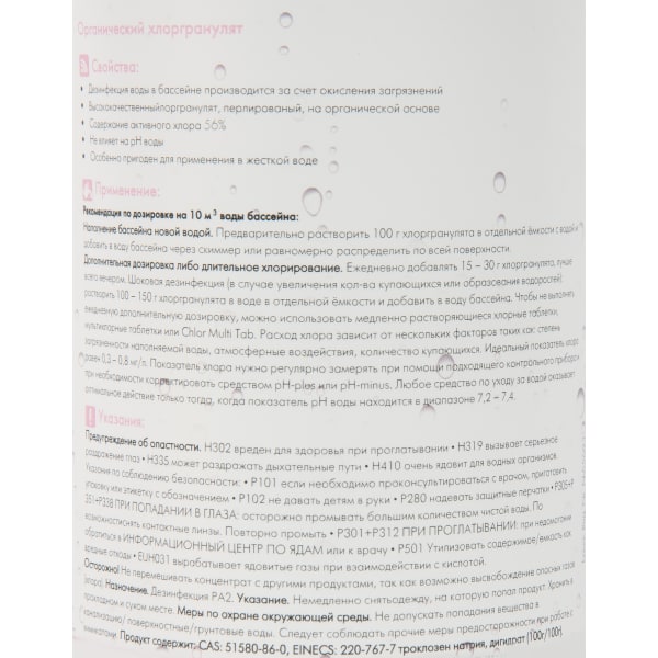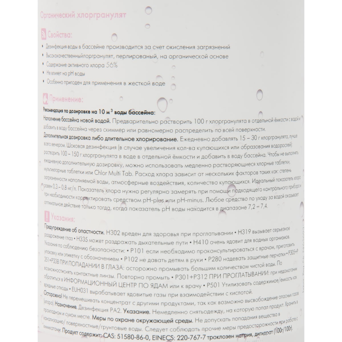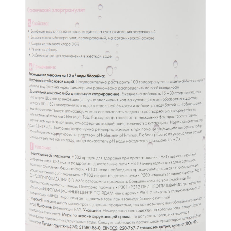 Условия использованияДезинфекция воды в бассейне происходит за счет окисления загрязнений. Содержание активного хлора 56%. Не влияет на pH воды. Особенно пригоден для применения в жесткой воде. Рекомендация по дозировке на 10 м³. Наполнение бассейна новой водой: предварительно растворить 100г хлоргранулята в отдельной емкости с водой и добавить в воду бассейна через скиммер или равномерно распределить по всей поверхности бассейна. Чтобы не выполнять ежедневную дозировку, можно использовать медленно растворяющиеся хлорные таблетки, мультихлорные таблетки. Любое средство по уходу за бассейном оказывает оптимальное действие, только когда pH воды находится в диапазоне 7,2 – 7,4.
