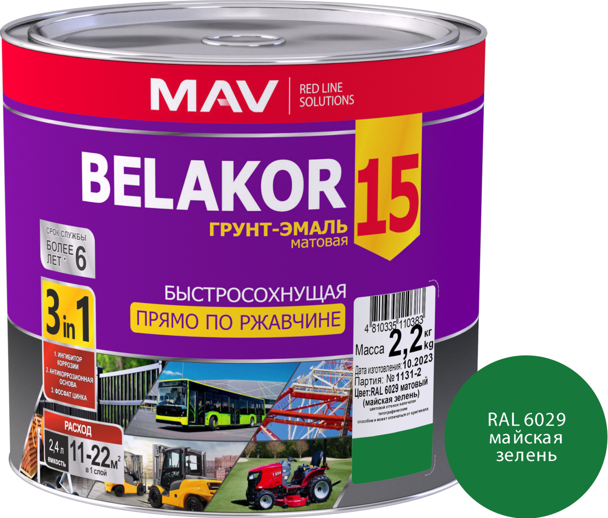 Грунт-эмаль BELAKOR 15 прямо по ржавчине 3 в 1 быстросохнущая RAL 6029 (майская зелень) матовая 2,4л (2,2кг)