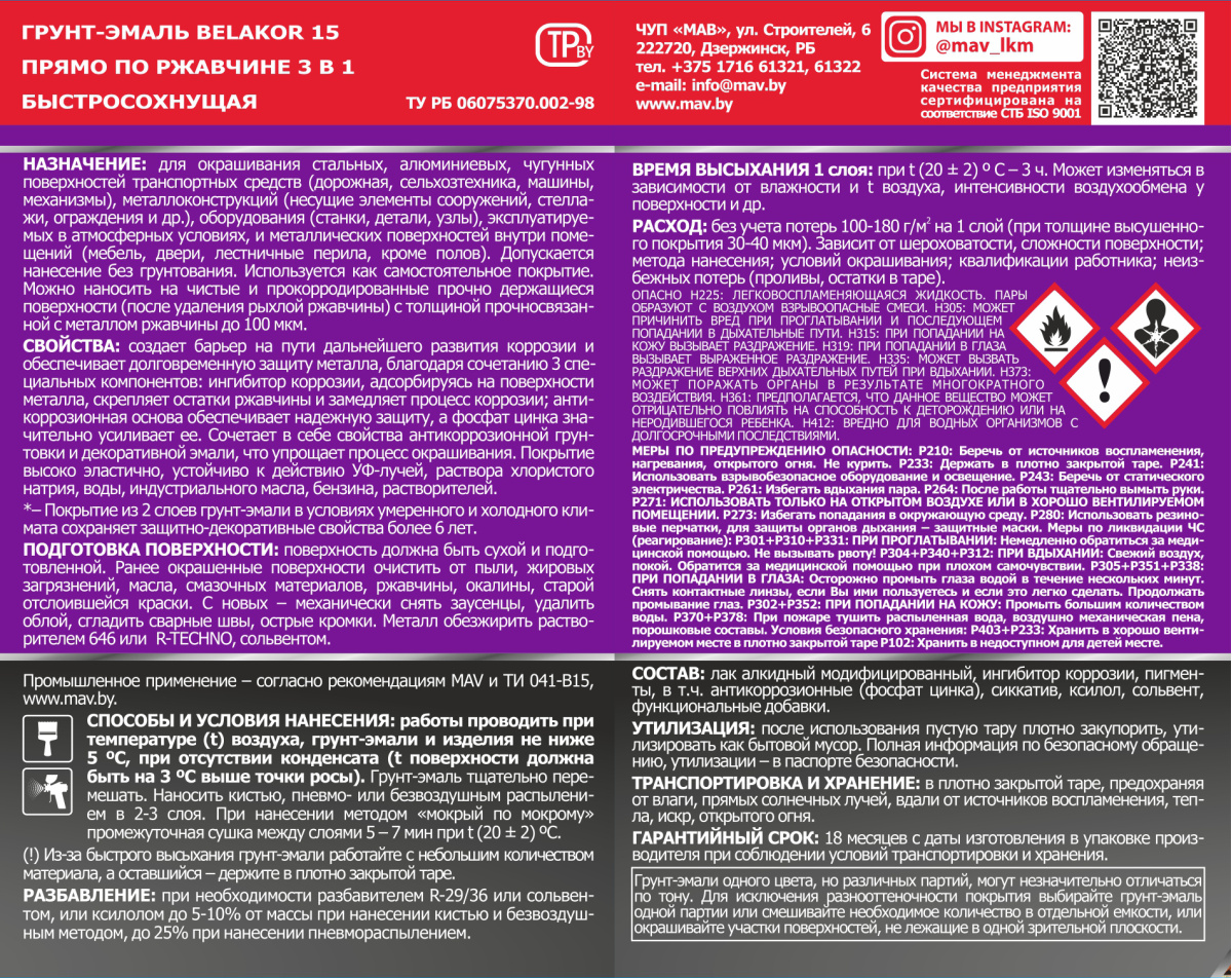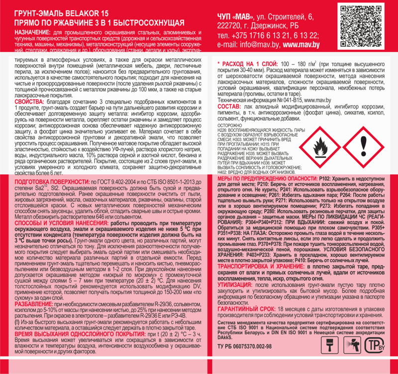 Для окрашивания стальных, алюминиевых и чугунных поверхностей транспортных средств, металлоконструкций, оборудования, эксплуатируемых в атмосферных условиях, для окраски металлических поверхностей внутри помещений; наносится без предварительного грунтования, используется как самостоятельное покрытие; подходит для нанесения на чистые и прокорродированные поверхности, а также на старые лакокрасочные покрытия. Создает барьер на пути дальнейшего развития коррозии и обеспечивает долговременную защиту металла. Расход — 100-180 г/м2 на 1 слой. Покрытие из 2 слоев грунт-эмали в умеренном и холодном климате сохраняет защитно-декоративные свойства более 6 лет. Наносить кистью, пневмораспылением или безвоздушным методом в 1-2 слоя. 1 л грунт-эмали покрывает 4,4-9 м2 в 1 слой. Представленный цвет на фото не является эталоном, т.к. монитор (экран) и принтер (в случае печати изображения) настолько близко воспроизводят реальные цвета насколько позволяют их технические параметры. Окончательно выбирайте цвет, руководствуясь реальными (оригинальными) выкрасами материала. Перед окраской делайте пробные выкрасы.