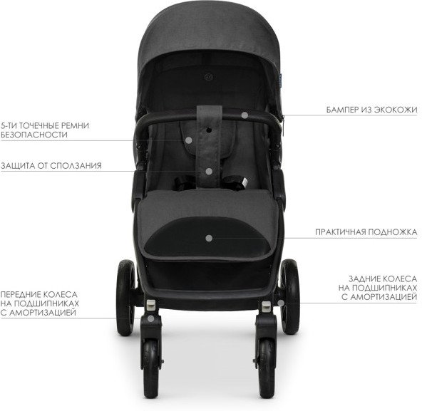 • Дополнительные удобства съемный бампер, капюшон, козырек от солнца, смотровое окно, регулируемая подножка