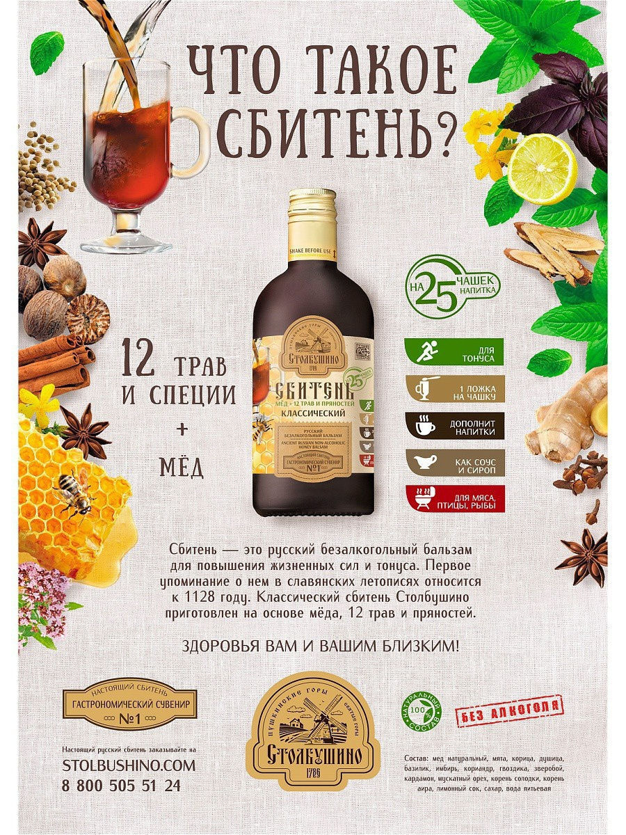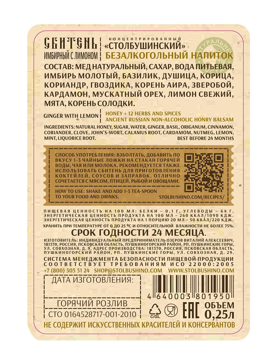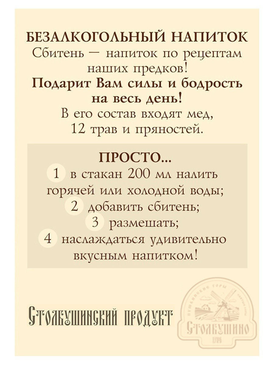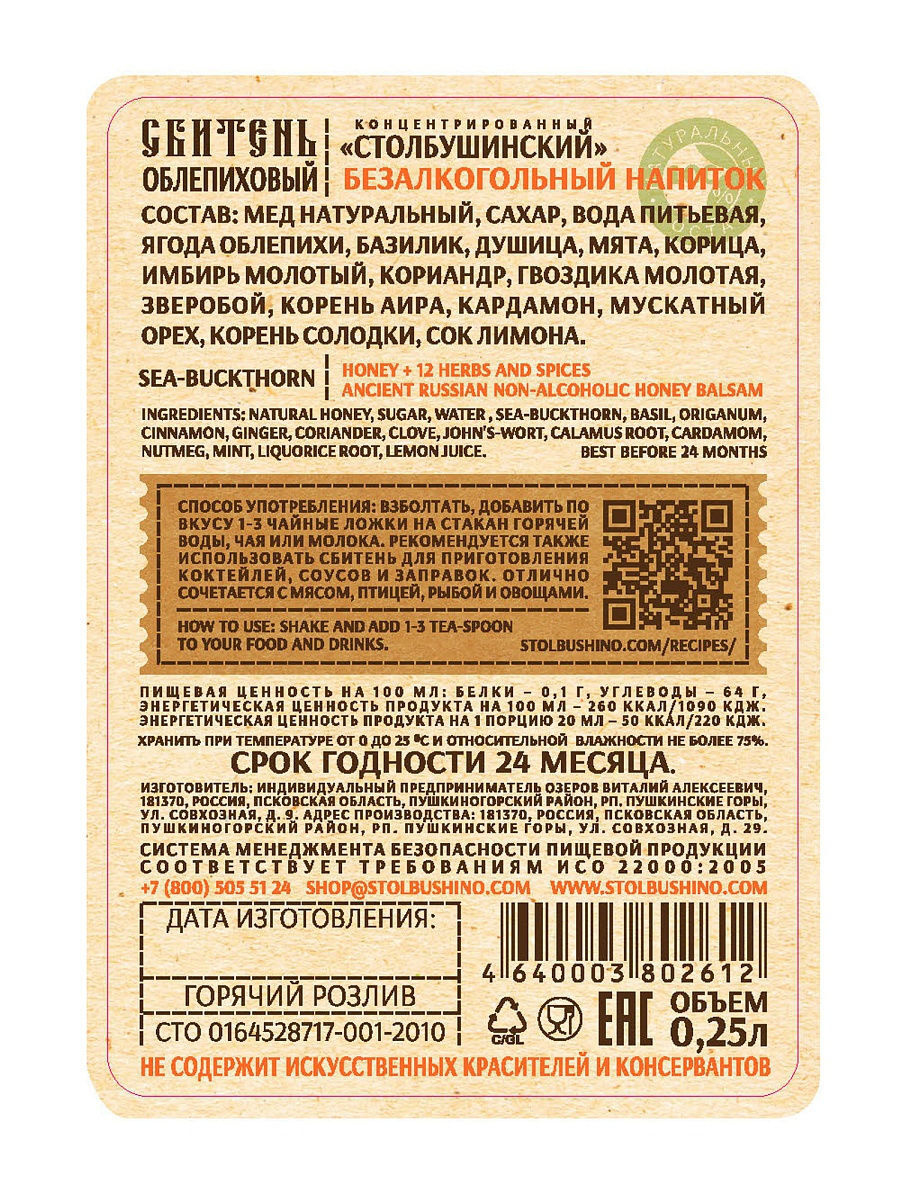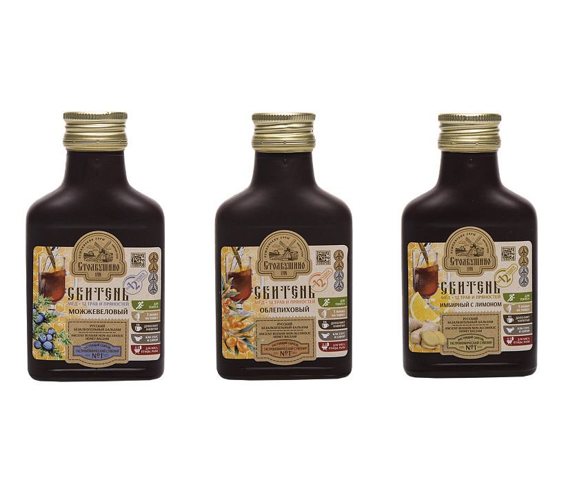 Набор сбитней Столбушино: Имбирь с лимоном 0.1 л + Облепиховый 0.1 л + Можжевельник 0.1 л сироп медовый с пряностями и травами