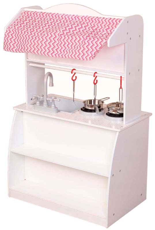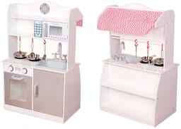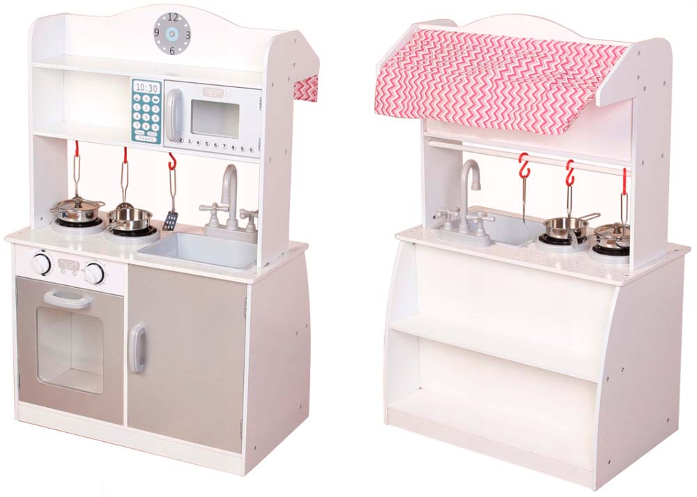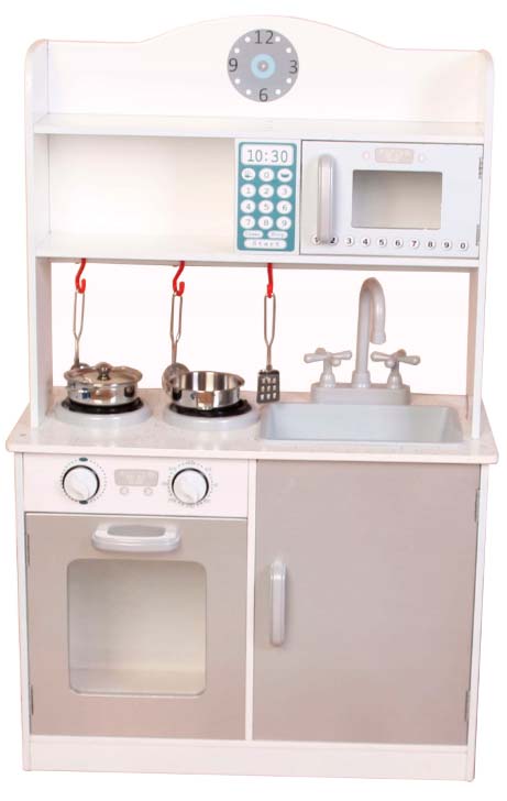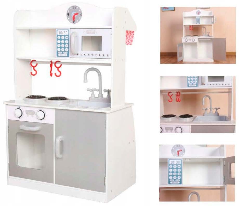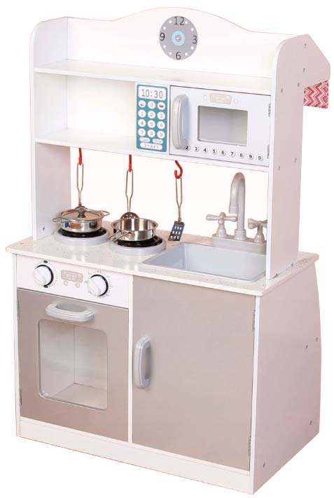 Детская кухня, сделанная из натурального дерева. Все игрушечные предметы отличаются от настоящих только размером, подвижные ручки для горелок духовки, дверь духовки, все открывается и закрывается. Набор состоит из плиты с духовкой, микроволновой печи, раковины с краном и ручками для воды, часы. В комплекте: кастрюля с крышкой, сковорода, щипцы, лопатка, черпак.