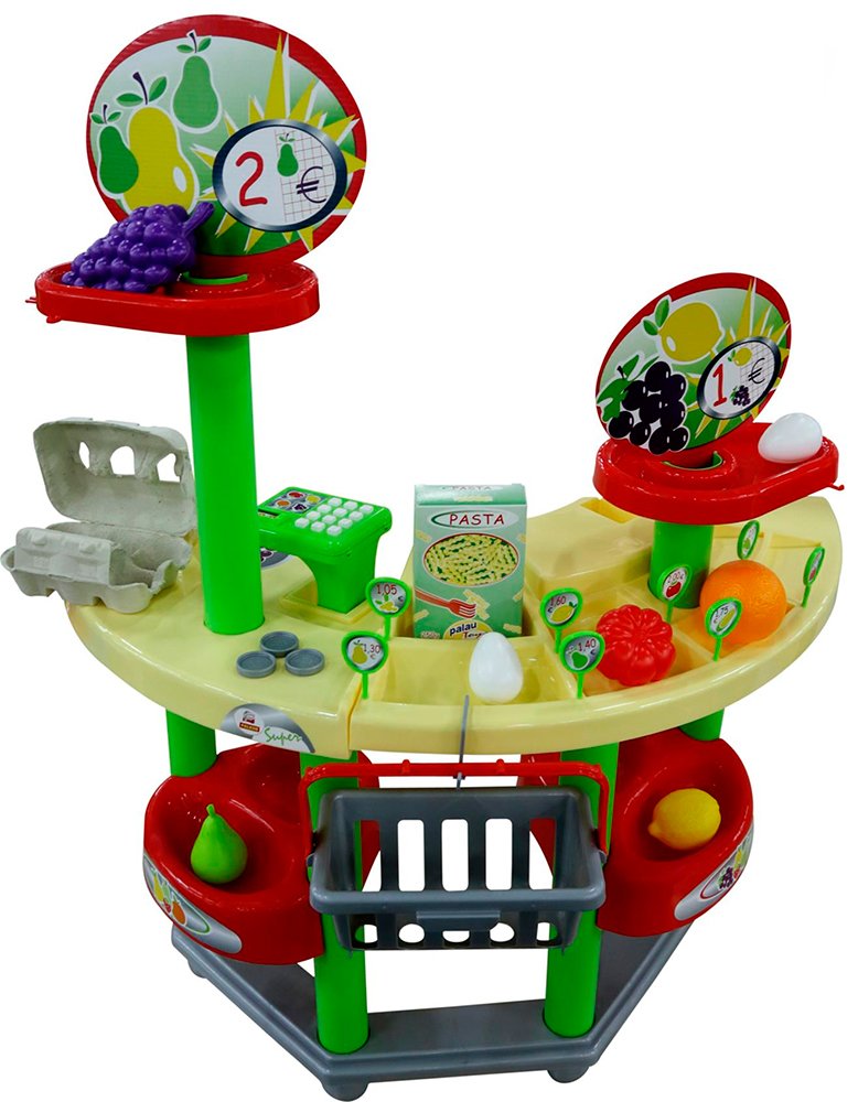 Игровой комплекс представляет собой витрину магазина с ячейками и полками, где можно выложить для продажи фрукты, овощи и другие продукты. В набор входит кассовый аппарат, корзинка для покупок, 8 ценников, пара монеток. Среди продуктов: куриные яйца, груша, помидор, апельсин, лимон, виноград, коробочка, имитирующая упаковку макаронных изделий. Размер в упаковке (ДхШхВ) 780х485х1020 мм.