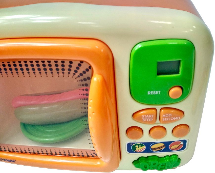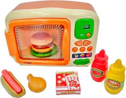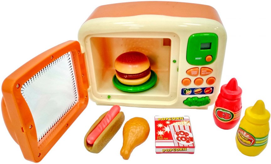Игрушечная микроволновая печь имитирует работу настоящего прибора. На панели управления имеются кнопки автоменю для 3-х различных продуктов. Установить время приготовления можно кнопкой ADD SECOND (до 20 с). Дверца открывается нажатием клавиши. В комплект входят: коробочка попкорна, 2 баночки с кетчупом и горчицей, куриная ножка, хот-дог и гамбургер.