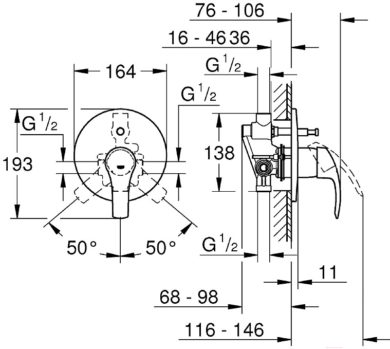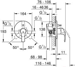 Смеситель GROHE Eurosmart 33305002; Материал: латунь; Длина: 146 мм; Назначение: для ванны и душа; Монтаж: скрытый