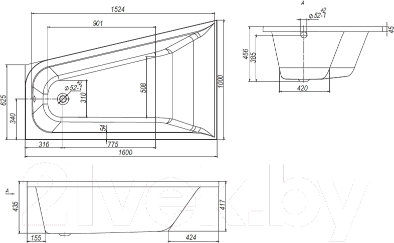 Ванна акриловая Ventospa Spirit LA 160x100 L; Размещение: встраиваемая; Гидромассаж: нет; Объем: 217 л; Защита от скольжения: есть; Толщина стенок: 5;5 мм
