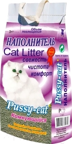 Наполнитель для туалета Pussy-cat PUS007 (10л); Вид наполнителя: комкующийся; Объем: 10 л; Аромат: без запаха; Состав: бентонитовый