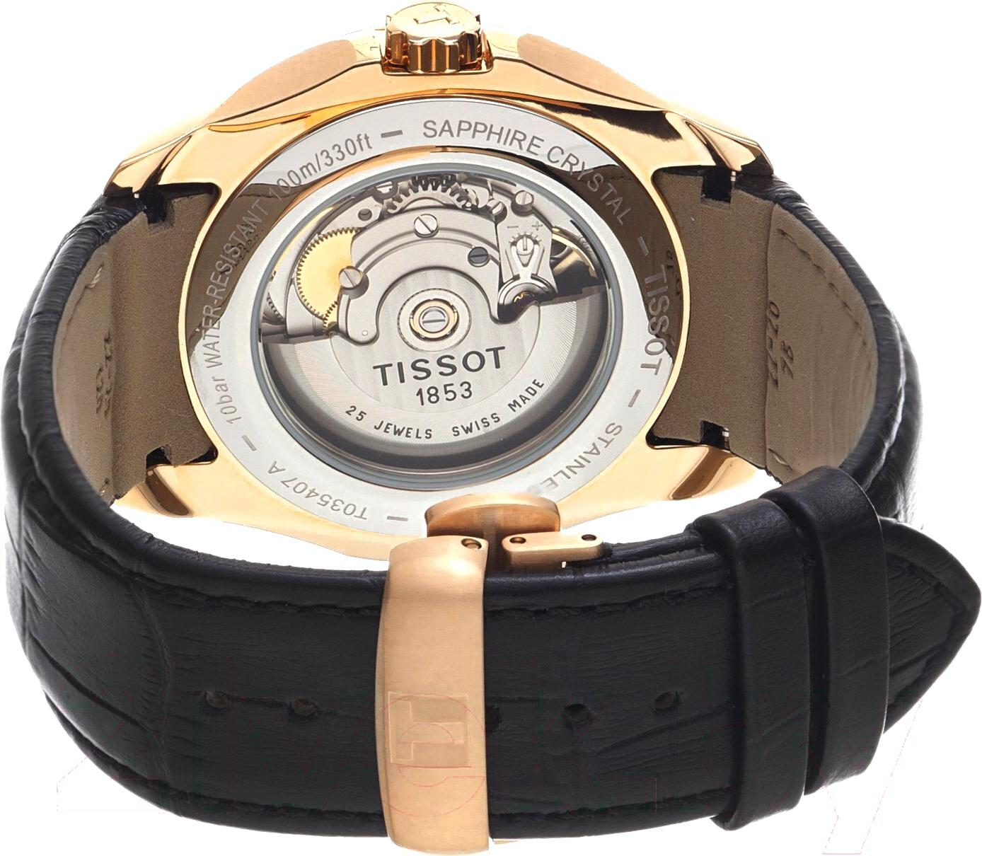 Часы наручные мужские Tissot T035.407.36.051.00; Тип: часы наручные мужские; Механизм: механический; Материал корпуса: нержавеющая сталь с PVD покрытием; Материал браслета: натуральная кожа; Водозащита: есть, 100 м; Стекло: сапфировое; Ширина корпуса: 39 мм; Индикация времени: стрелки; Доп. индикация времени: секунды, дата, день недели