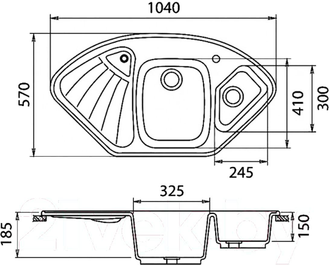 Мойка кухонная GranFest Corner GF-C1040E (черный); Диаметр сливного отверстия: 3.5"; Длина/диаметр мойки: 104 см; Ширина мойки: 57 см; Материал: искусственный мрамор; Комплект поставки: слив, сифон, корзинчатый вентиль 3.5"