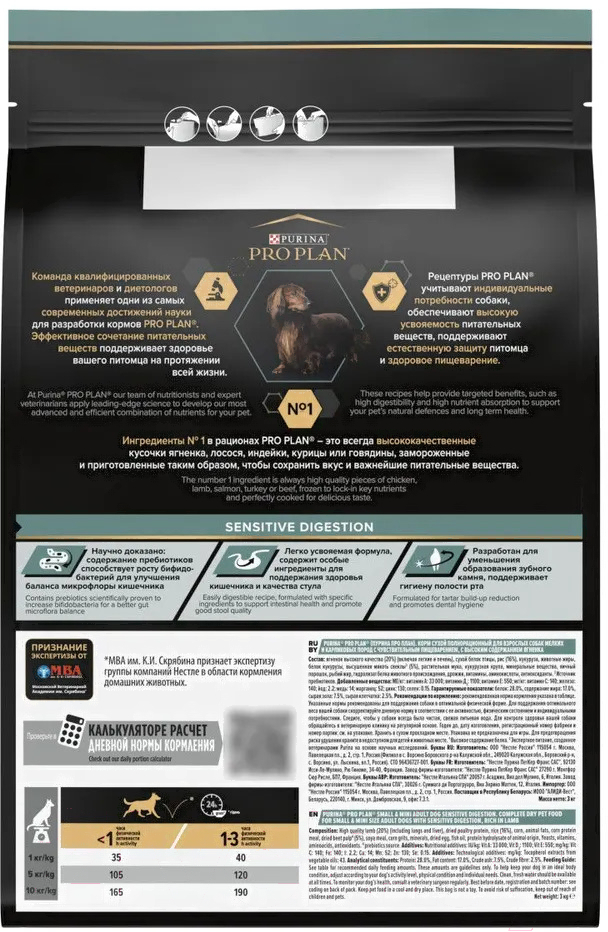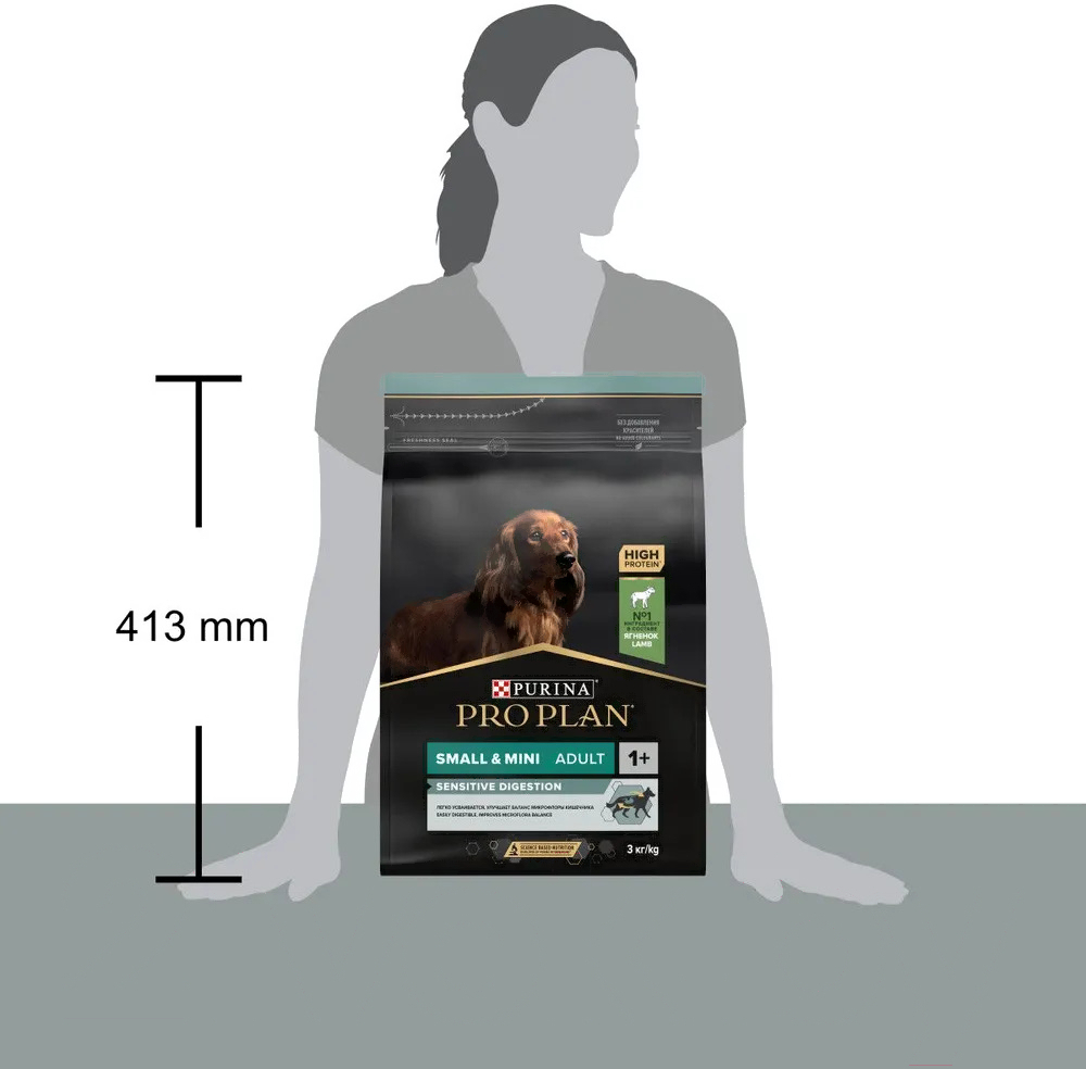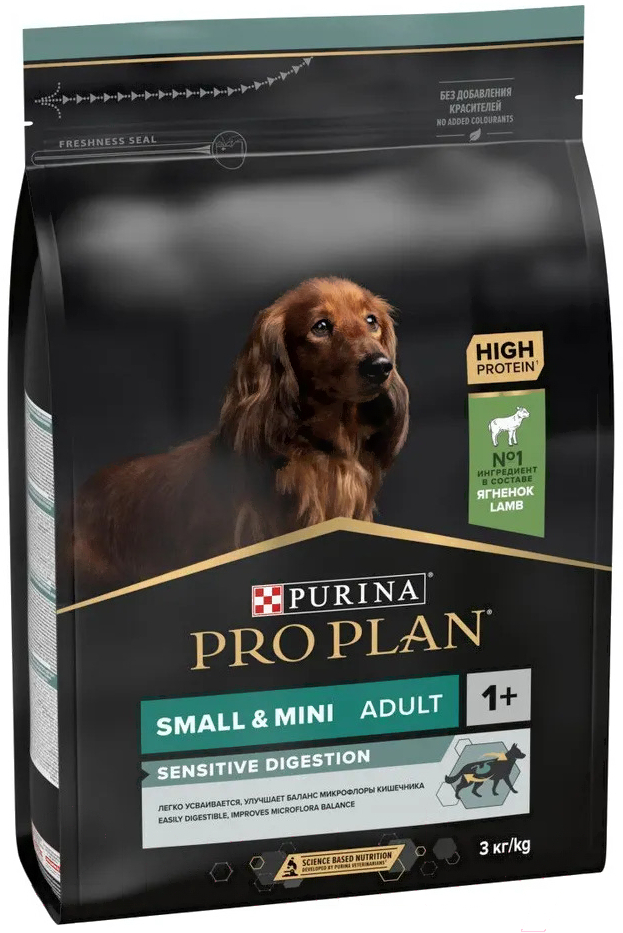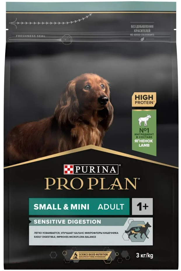 Корм для собак Pro Plan Adult Small & Mini Sensitive Digestion с ягненком и рисом (3кг); Тип корма: сухой корм; Виды собак: взрослые, мелкие породы; Назначение: повседневный, для чувствительной системы пищеварения; Основные ингредиенты: рис, ягненок; Общий вес упаковки: 3 кг; Класс корма: супер-премиум