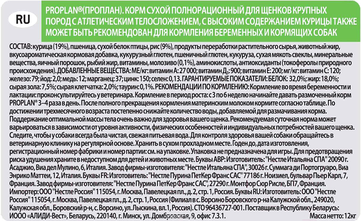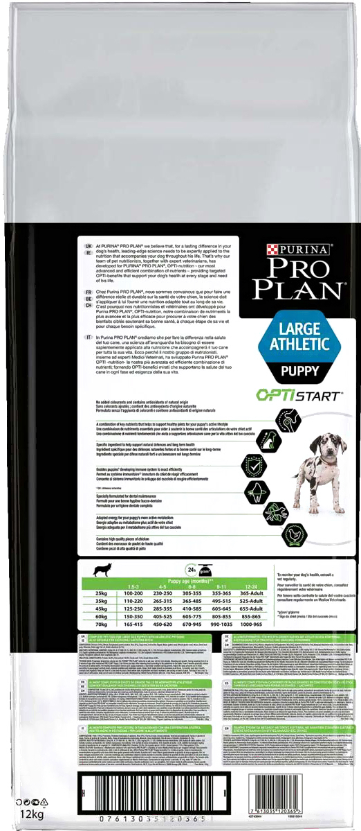 Корм для собак Pro Plan Puppy Large Athletic с курицей (12кг); Тип корма: сухой корм; Виды собак: щенки/кормящие собаки, крупные породы; Назначение: повседневный; Основные ингредиенты: рис, курица; Общий вес упаковки: 12 кг; Класс корма: супер-премиум