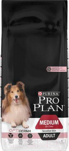 Корм для собак Pro Plan Adult Medium Sensitive Skin с лососем и рисом (14кг); Тип корма: сухой корм; Виды собак: взрослые, средние породы, крупные породы; Назначение: повседневный, для чувствительной кожи; Основные ингредиенты: рис, лосось; Общий вес упаковки: 14 кг; Класс корма: супер-премиум
