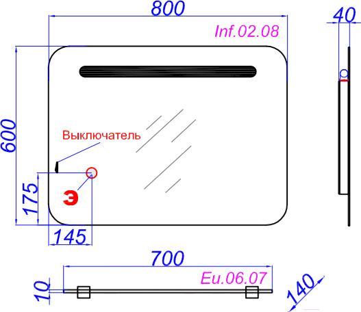 • Форма зеркала прямоугольная