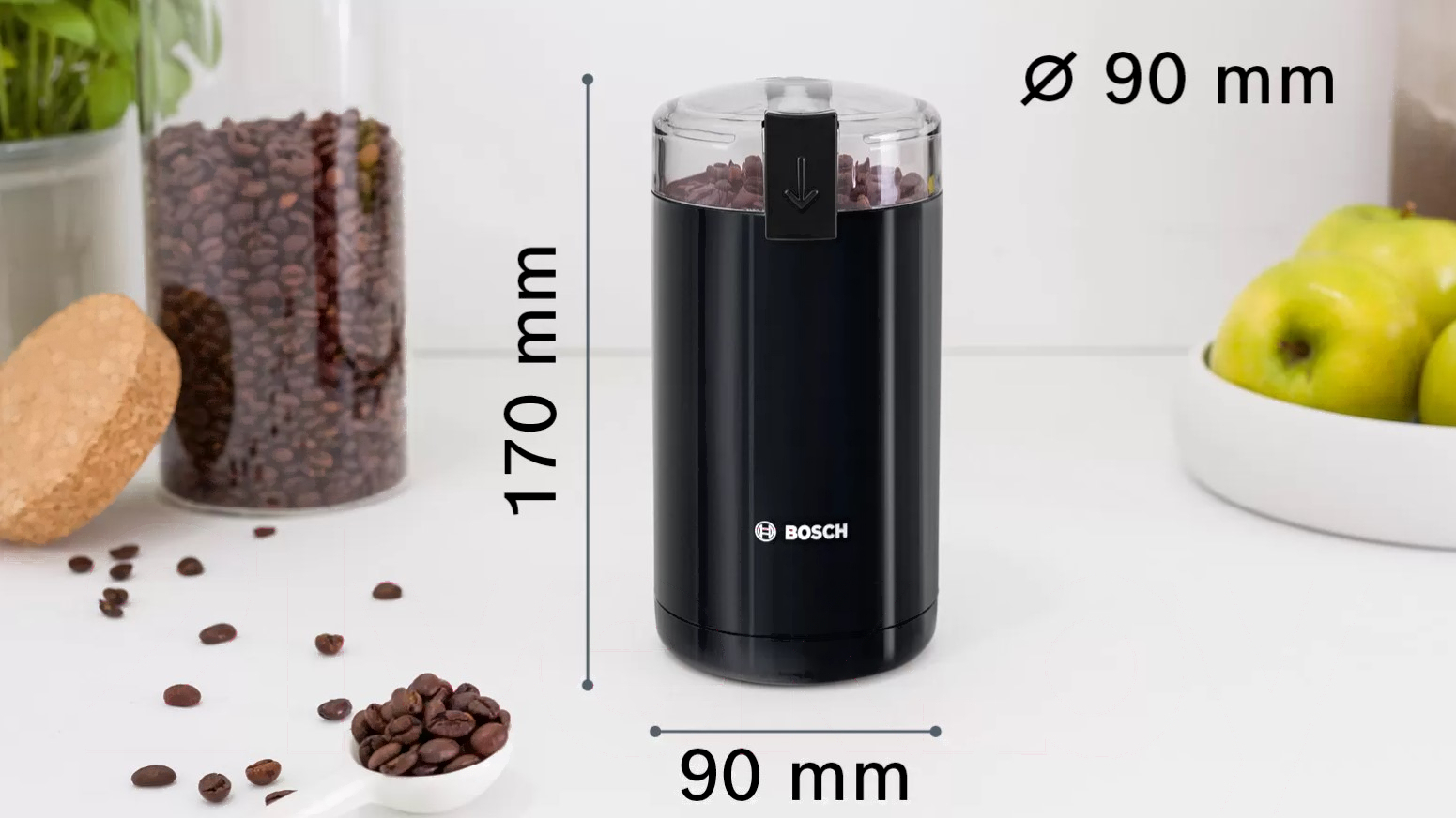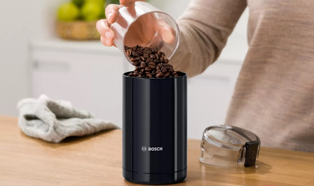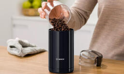 Кофемолка Bosch MKM6003; Система помола: вращающийся нож; Мощность: 180 Вт; Вместимость контейнера для зерен: 75 г; Материал корпуса: пластик; Пуск: удерживание кнопки; Количество степеней помола: 1