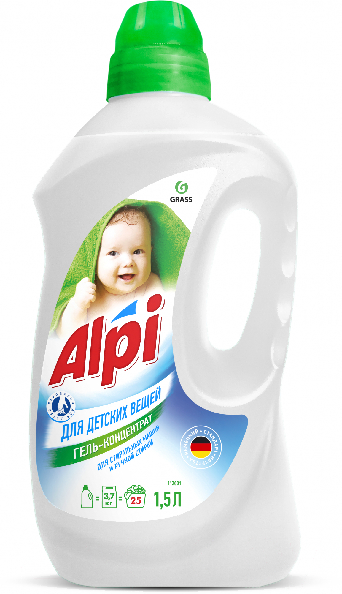Гель для стирки Grass Alpi для детских вещей (1.5л); Тип: гель для стирки; Тип стирки: ручная, машинная; Назначение: для детского; Объем: 1.5 л