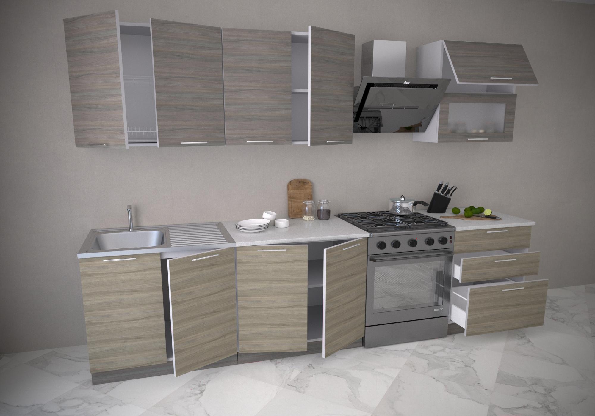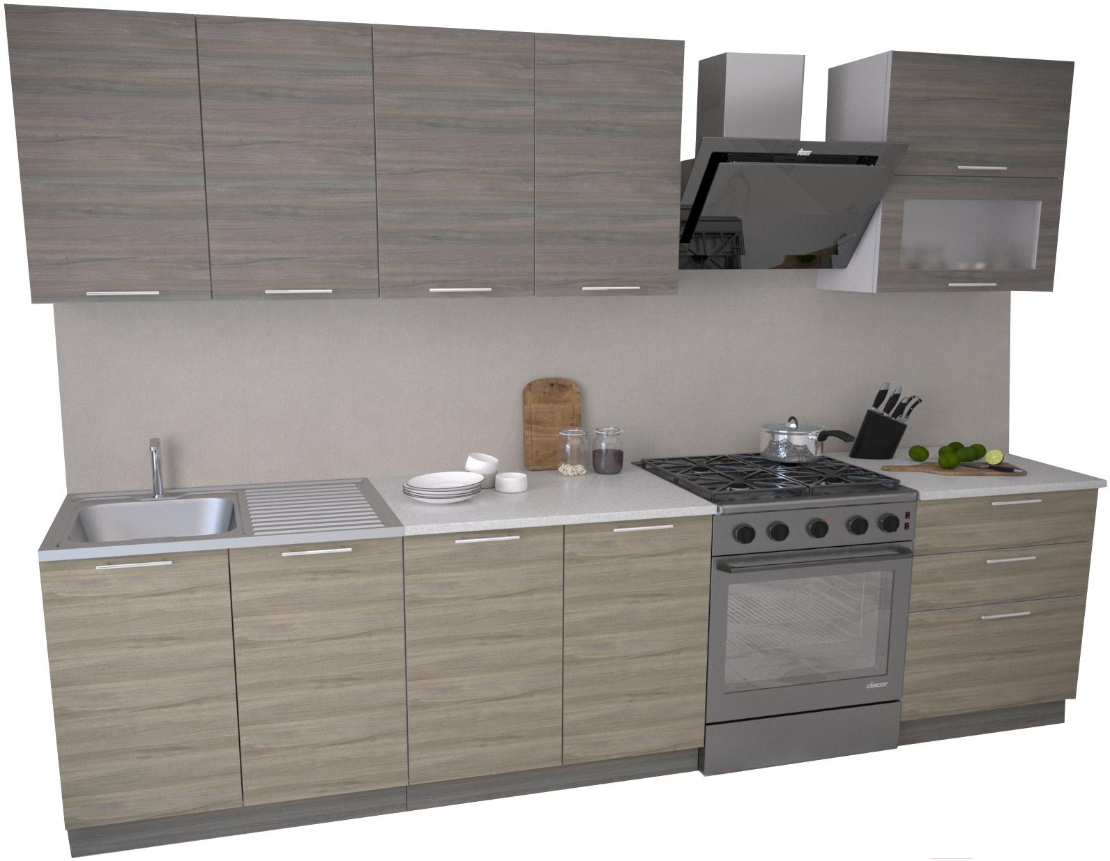 Готовая кухня Иволанд Трейд Вяз 220-220-60 (светлый/темный); Длина кухни: 220 см; Конструкция кухни: линейная; Материал фасада: ЛДСП; Столешница: отдельная на каждый шкаф; Ширина шкафа под мойку: 80 см; Материал каркаса: ЛДСП; Установка мойки: накладная мойка; Ширина кухни: 60 см; Тип фасада: прямой