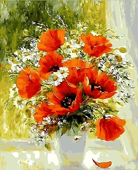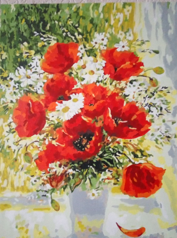 Картина по номерам Picasso Маки и ромашки (PC4050218); Кол-во цветов в наборе: 29; Комплектация набора: контрольный лист, холст, краски, кисти, инструкция, крепление; Материал холста: текстиль; Ширина рабочей области: 40 см; Высота рабочей области: 50 см; Сложность: 4