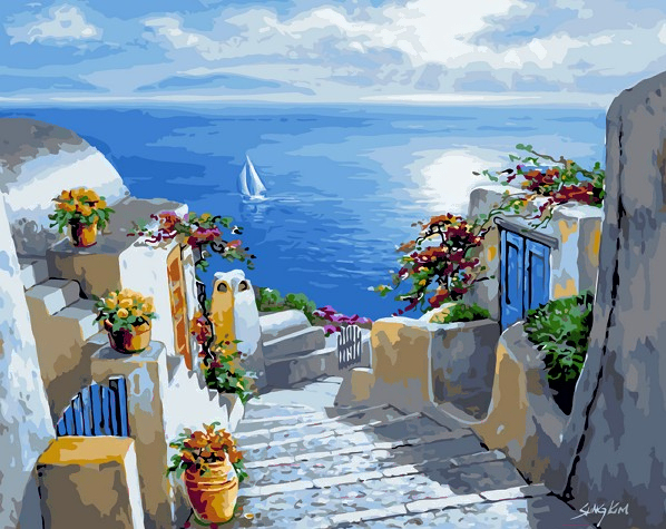 Картина по номерам Picasso Ступеньки к морю (PC4050225); Кол-во цветов в наборе: 29; Комплектация набора: контрольный лист, холст, краски, кисти, инструкция, крепление; Материал холста: текстиль; Ширина рабочей области: 50 см; Высота рабочей области: 40 см; Сложность: 4