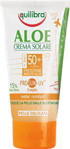 Крем солнцезащитный Equilibra Aloe с комплексом Prosun-UV SPF50+ (75мл); Действие: защита от солнца, увлажняющее, успокаивающее; Фактор SPF: 50; Область применения: тело; Тип кожи: очень светлая; Водостойкое средство: есть