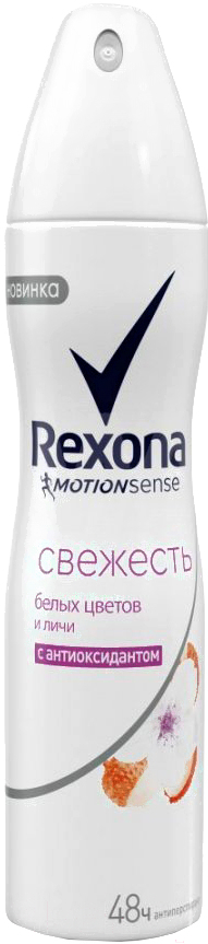 Дезодорант-спрей Rexona Белые цветы и личи (150мл); Тип кожи: для всех типов; Пол: для женщин; Время действия: 48 ч; Отдушка: ягодная, цветочная; Объём: 150 мл