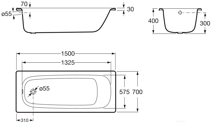 Ванна стальная Roca Contesa 150x70 (без ножек); Размещение: встраиваемая; Гидромассаж: нет; Объем: 153 л; Толщина стенок: 2.4;2.4 мм