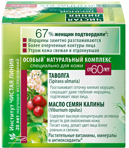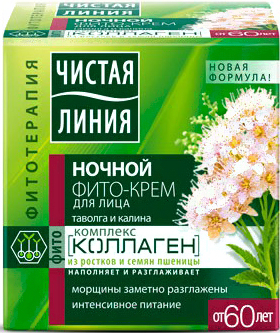 Крем для лица Чистая Линия Таволга и калина от 60 лет ночной (45мл); Действие: увлажняющее, выравнивание тона, антивозрастной уход, лифтинг, придание сияния, освежающее; Тип кожи: возрастная; Пол: для женщин; Возраст: 60+; Время применения: ночное; Коллекция: Фитоколлаген (Чистая линия); Объём: 45 мл