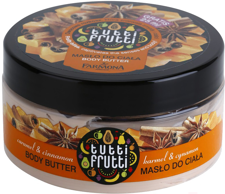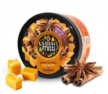 Масло для тела Farmona Tutti Frutti Карамель и Kорица (200мл); Тип кожи: для всех типов; Действие: питание, увлажняющее; Активные ингредиенты: масло карите, масло ши; Объём: 200 мл