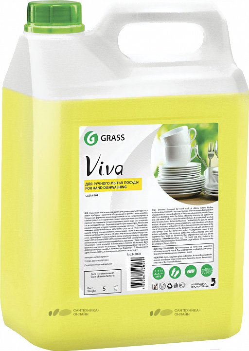 Средство для мытья посуды Grass Viva / 345000 (5л); Консистенция: гель; Использование средства: в холодной воде; Объем: 5000 мл; Аромат: лимон
