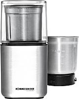 Кофемолка Rommelsbacher EGK 200; Система помола: вращающийся нож; Мощность: 200 Вт; Вместимость контейнера для зерен: 70 г; Материал корпуса: металл / пластик; Пуск: удерживание кнопки