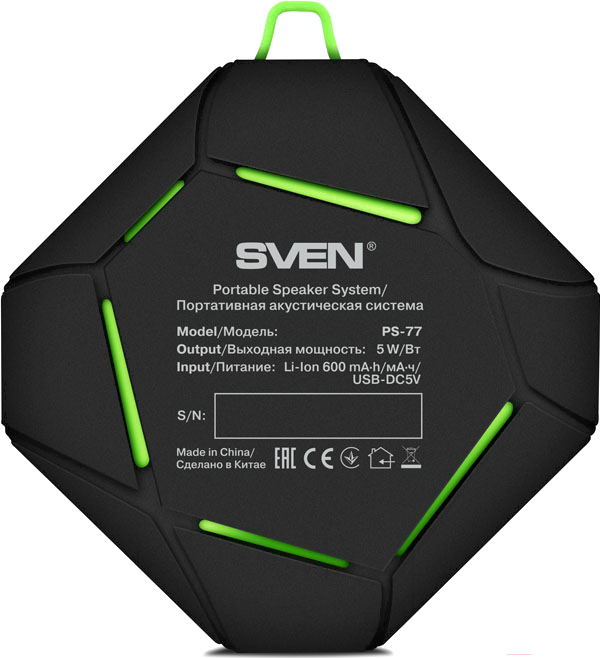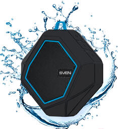 Портативная колонка Sven PS-77 (черный/синий); Интерфейсы: USB, вход 3.5 мм; Общая выходная мощность: 5 Вт; Тип питания: встроенный аккумулятор, USB; Вес: 0.21 кг; Ширина: 8.6 см