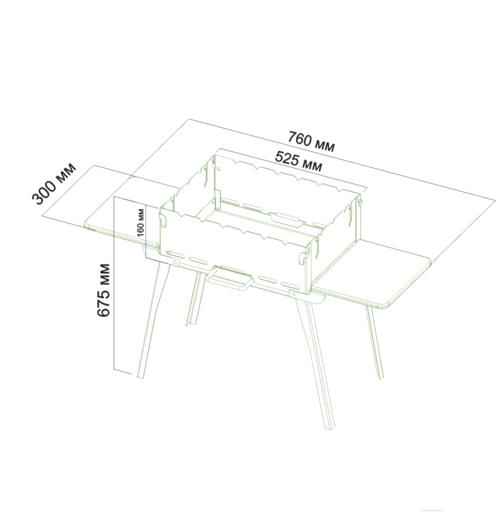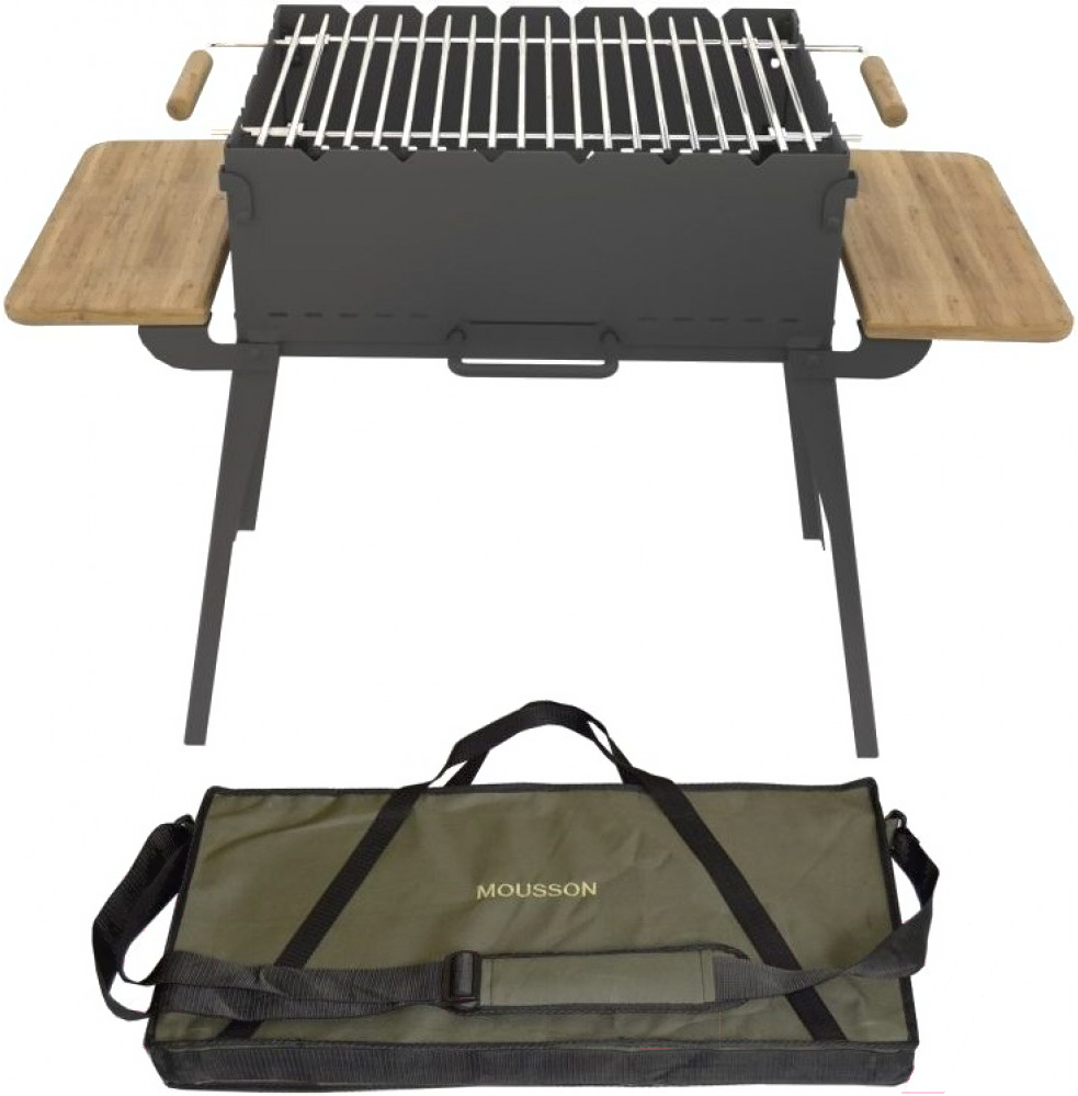 Мангал Mousson Germes 6 VBR; Конструкция: разборная; Материал: сталь; Вид используемого топлива: готовый уголь, дрова; Функции: гриль; Высота: 52.5 см; Длина: 76 см; Ширина: 30 см